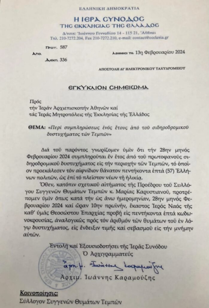 Κατόπιν σχετικού αιτήματος της προέδρου του Συλλόγου Συγγενών Θυμάτων Τεμπών 2023, Μαρίας Καρυστιανού, στην Ιερά Αρχιεπισκοπή Αθηνών και στις Ιερές Μητροπόλεις της Εκκλησίας της Ελλάδος, οι καμπάνες σε όλες τις εκκλησίας της χώρας χτύπησαν στις 10:00 το πρωί 57 φορές, μία για κάθε ψυχή που χάθηκε.
