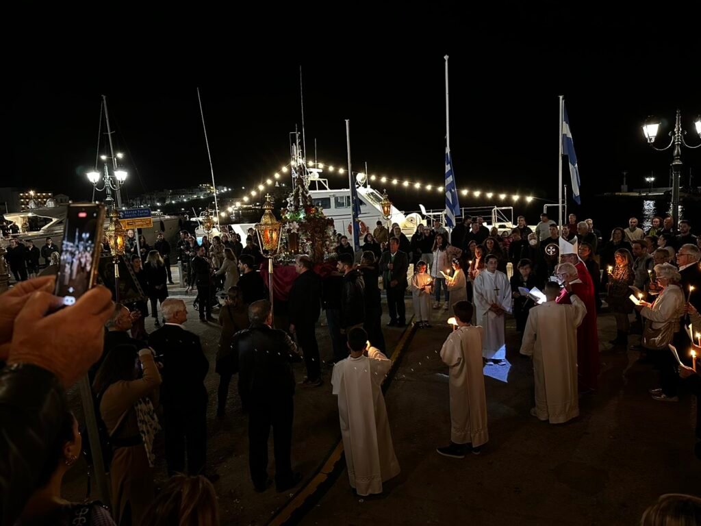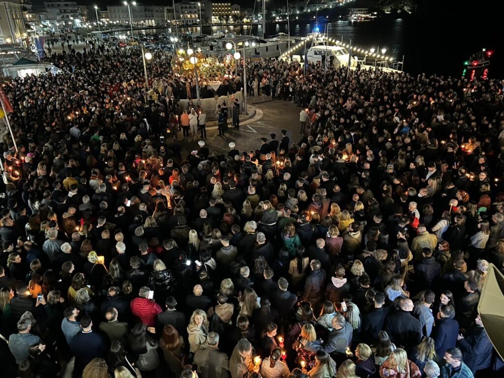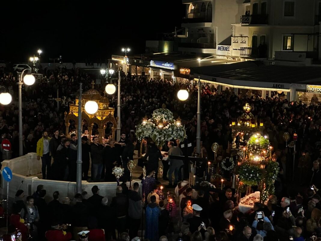 Η πλατεία Παντανάσσης Τήνου γέμισε με την παρουσία εκατοντάδων πιστών, που συγκεντρώθηκαν όπου έγινε η συνάντηση των Επιταφίων του Νησιού.