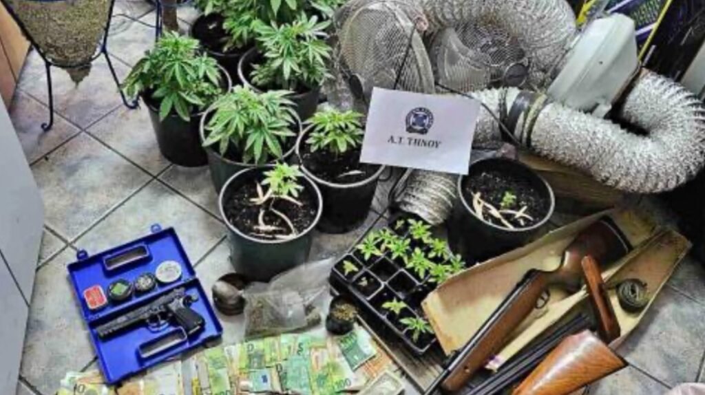 Συνελήφθησαν χθες (Δευτέρα 3 Ιουνίου 2024) στην Τήνο, από αστυνομικούς του Αστυνομικού Τμήματος Τήνου, δύο ημεδαποί ηλικίας 51 και 59 ετών σε βάρος των οποίων σχηματίσθηκε δικογραφία για κατοχή – διακίνηση ναρκωτικών, καλλιέργεια κάνναβης, κατοχή αρχαιοτήτων και οπλοκατοχή.