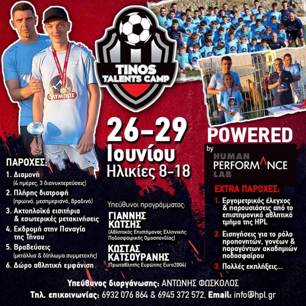 Η Human Performance Lab σε συνεργασία με τον Αντώνη Φώσκολο, Υπεύθυνο Διοργάνωσης, πραγματοποιεί και φέτος το « TINOS TALENTS CAMP 2023 » , 26 – 29 Ιουνίου, για αθλητές από 8 έως 18 ετών.