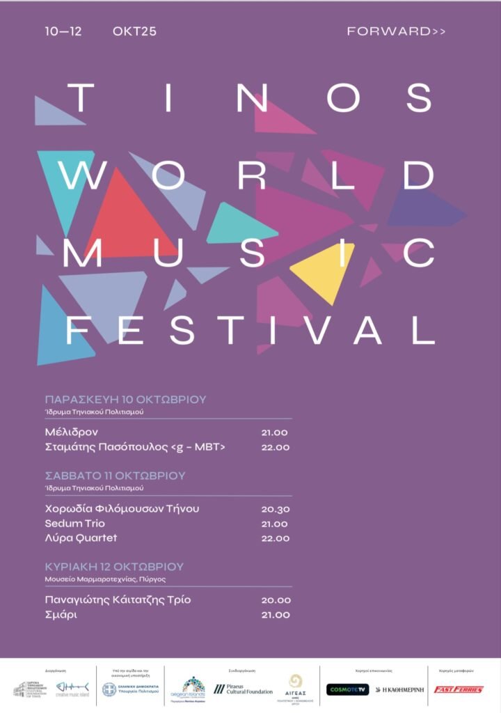 Το φετινό 11ο Tinos World Music Festival, που θα πραγματοποιηθεί από τις 10 έως τις 12 Οκτωβρίου στην Τήνο, κοιτάζει μπροστά και παρουσιάζει για πρώτη χρονιά την θεματική «Forward>>». Στόχος του είναι η διερεύνηση της σχέσης της μουσικής του παρελθόντος με αυτή του μέλλοντος και του τρόπου με τον οποίο οι μουσικές παραδόσεις αντιμετωπίζονται με τρόπο δημιουργικό και σε συνδυασμό με σύγχρονα ακούσματα, ανανεώνοντας και διαμορφώνοντας τη μουσική που θα ακούν οι επόμενες γενιές.