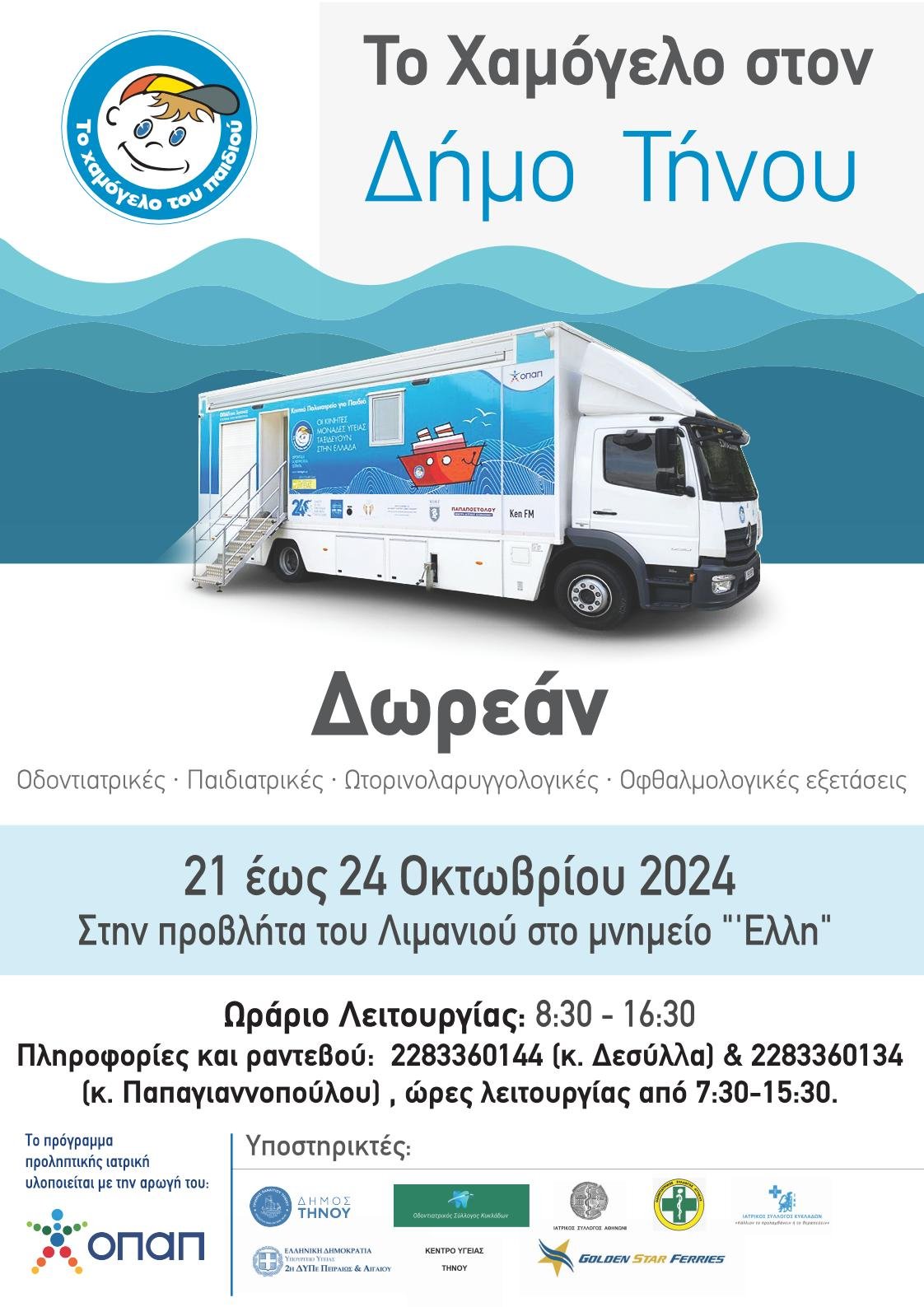 Από τη Δευτέρα 21 έως και την Πέμπτη 24 Οκτωβρίου 2024, στο πλαίσιο της Δράσης Προληπτικής Ιατρικής / Οδοντιατρικής «ΙΠΠΟΚΡΑΤΗΣ» που υλοποιεί ο Οργανισμός «Το Χαμόγελο του Παιδιού» από το 2002, θα πραγματοποιηθούν δωρεάν προληπτικές οδοντιατρικές, παιδιατρικές και οφθαλμολογικές εξετάσεις στα παιδιά/μαθητές του Δήμου Τήνου.