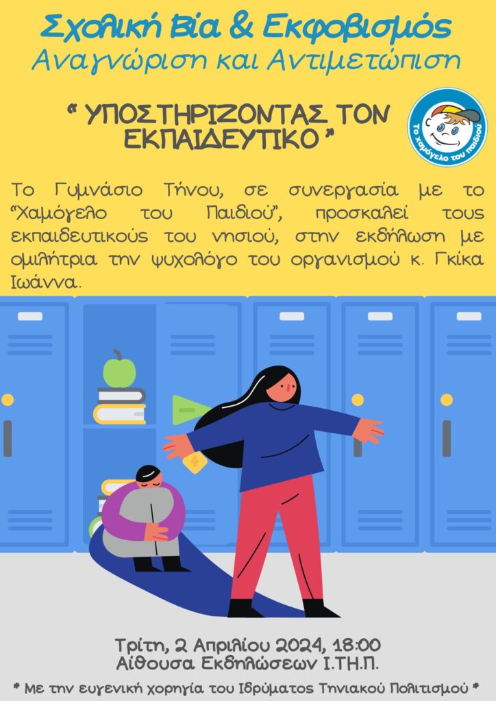 To Γυμνάσιο Τήνου με μεγάλη χαρά ανακοινώνει την πραγματοποίηση σειράς εκδηλώσεων για την εκπαιδευτική κοινότητα της Τήνου, σε συνεργασία με το Ίδρυμα “Το Χαμόγελο του Παιδιού”, για το θέμα της Ενδοσχολικής Βίας και του Εκφοβισμού. Η υπεύθυνη των εκπαιδευτικών προγραμμάτων του Ιδρύματος, κ. Ιωάννα Γκίκα, θα βρίσκεται στην Τήνο στο διάστημα 1 έως 5 Απριλίου για την υλοποίηση εκπαιδευτικών δράσεων σε σχολεία (Γυμνάσιο Τήνου, 1 και 2 Απριλίου, Δημοτικό Σχολείο Εξωμβούργου, 3 Απριλίου, 2ο Δημοτικό Τήνου, 4 Απριλίου και 2ο – 3ο Νηπιαγωγείο, 5 Απριλίου). Παράλληλα θα προσφέρει δύο απογευματινά σεμινάρια για εκπαιδευτικούς και γονείς.