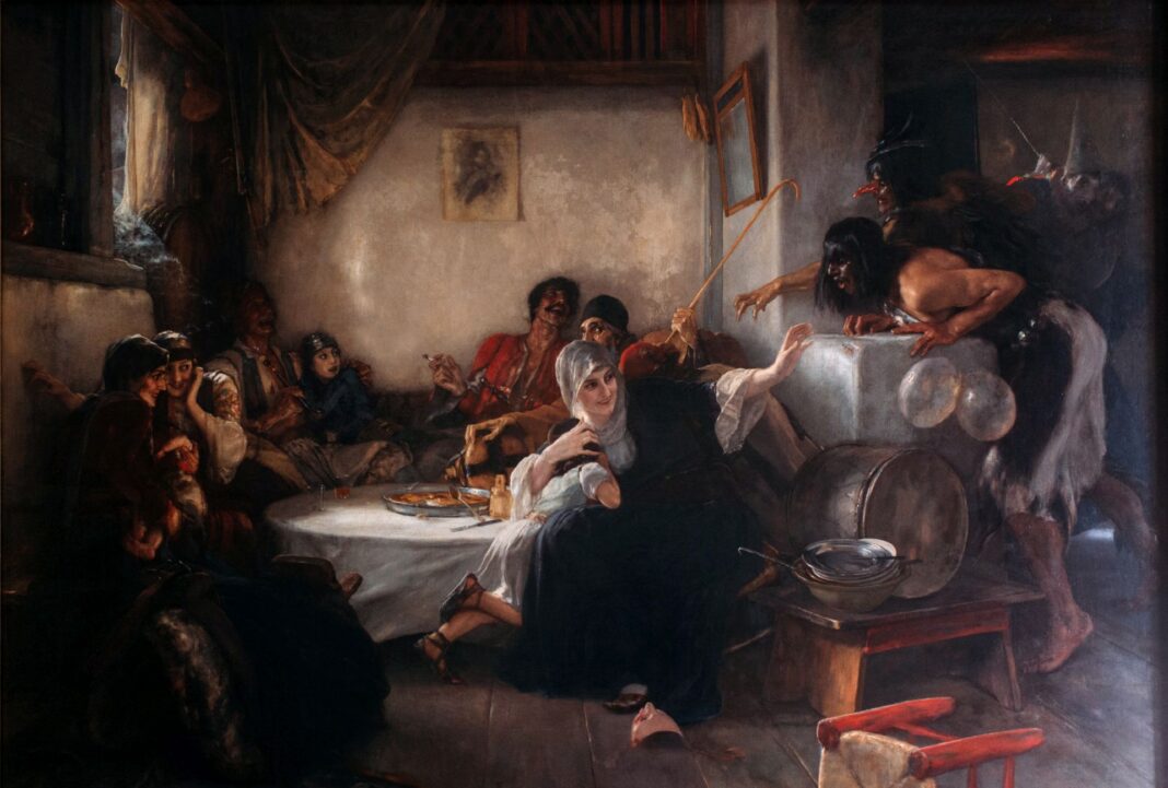 »Στο εσωτερικό ενός φτωχικού σπιτιού, στα μέσα του 19ου αιώνα, μία οικογένεια καθισμένη γύρω από το τραπέζι, διασκεδάζει με το έθιμο των μασκαράδων όταν αυτοί εισβάλουν για να τρομάξουν τα παιδιά. Η σκηνή, λουσμένη σε ένα ζεστό φως που μπαίνει από το παράθυρο, ανακατεύεται με τη μυρωδιά του γαλακτομπούρεκου, τον καπνό απ’ το τσιγάρο και τις αγκαλιές των παιδιών. Οι αισθήσεις και τα συναισθήματα κυριαρχούν σε αυτό το αριστουργηματικό έργο που αποτελεί αναμφίβολα ένα από τα καλύτερα του κορυφαίου». Είναι κι αυτό ένα έργο της ωριμότητάς του ζωγράφου (που γεννήθηκε την 1η Μαρτίου 1842 στο Σκλαβοχώρι της Τήνου), που ξεκάθαρα υπογραμμίζουν τη νοσταλγία του για την πατρίδα.