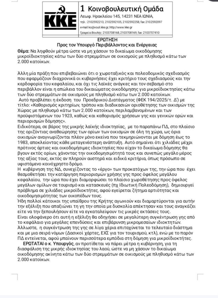 Το ΚΚΕ καταγγέλλει την κυβερνητική πολιτική για τα οικόπεδα σε οικισμούς κάτω των 2.000 κατοίκων, κάνοντας λόγο για “συνειδητή απαξίωση” της μικρής ιδιοκτησίας.