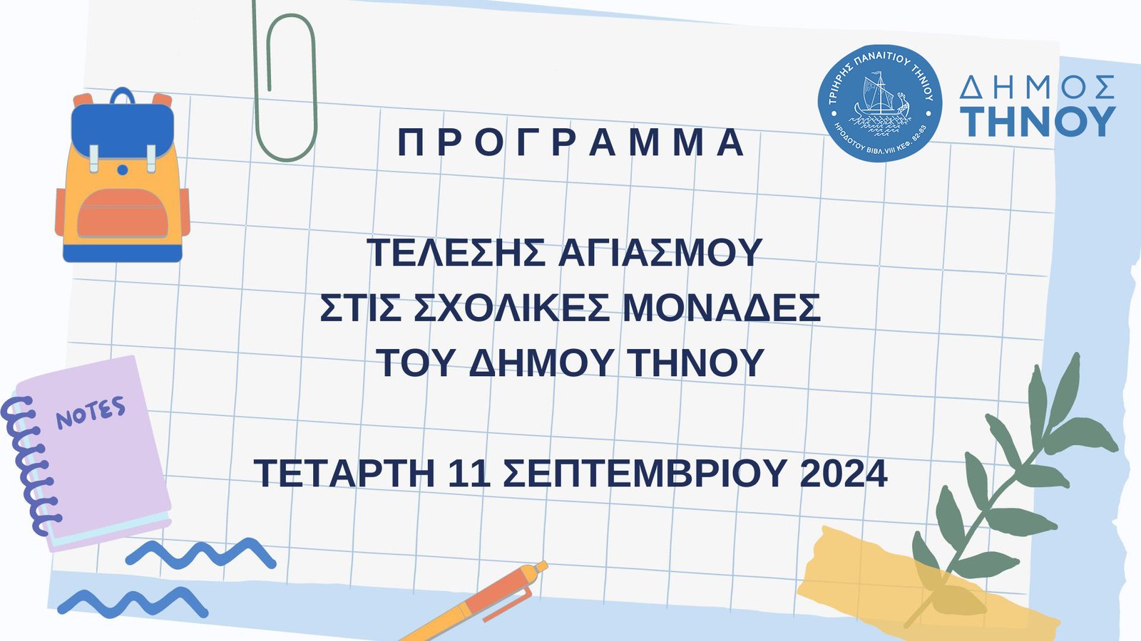 Την Τετάρτη 11 Σεπτεμβρίου 2024 θα τελεσθεί ο καθιερωμένος Αγιασμός στα Σχολεία του Δήμου Τήνου για την έναρξη της νέας σχολικής χρονιάς 2024-2025.