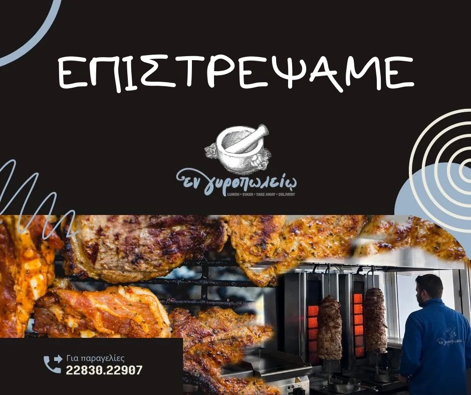 Η ομάδα του ψητοπωλείου “εν γυροπωλείω” επιστρέφει ξανά κοντά σας από σήμερα 17 Μαρτίου ανανεωμένοι και με πολύ διάθεση!