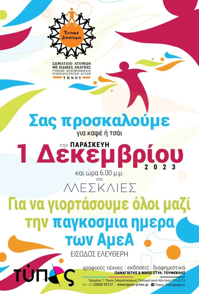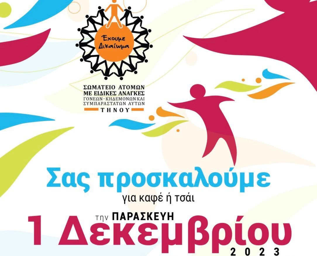 Το σωματείο “Έχουμε Δικαίωμα” σας προσκαλεί να γιορτάσουμε την παγκόσμια ημέρα των ΑμεΑ για καφέ η τσάι, στις 1 Δεκεμβρίου στις 6:00 μμ στο Μεσκλιές.