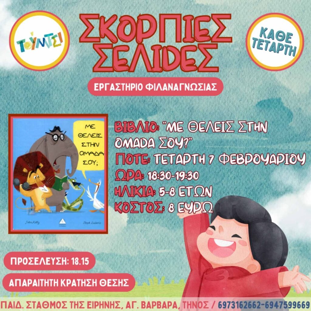 Το εργαστήριο “Σκόρπιες Σέλιδες” την Τετάρτη 7 Φεβρουαρίου θα φιλοξενήσει το βιβλίο “Με θέλεις στην ομάδα σου;” των εκδόσεων Τζιαμπίρης-Πυραμίδα.