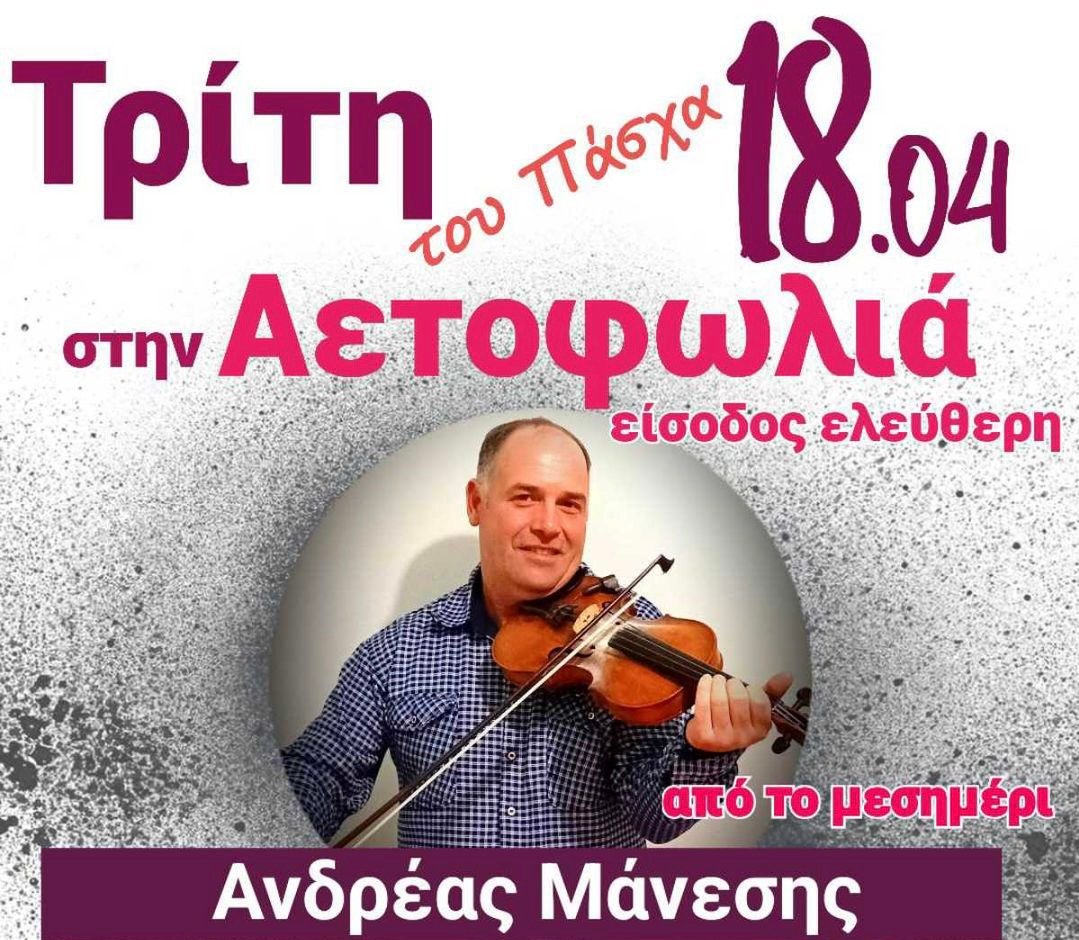 Την Τρίτη του Πάσχα 18/4 από το μεσημέρι, ο Πολιτιστικός Σύλλογος Αετοφωλιάς σας καλεί στο τέρμα του χωριού, παρέα με τον Ανδρέα Μάνεση, τον Γιάννη Μιχαήλ και τον Κωνσταντίνο Βιδάλη.