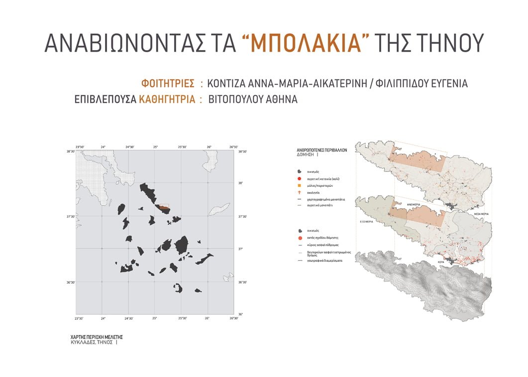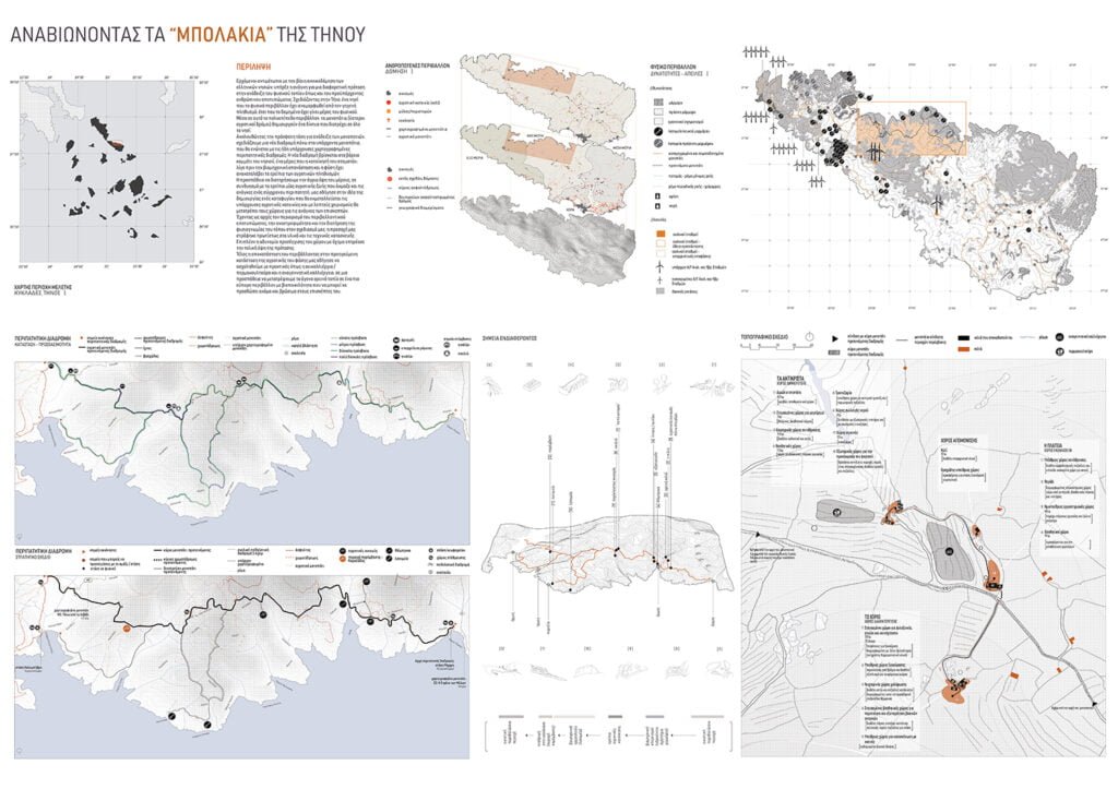 Ερχόμενοι αντιμέτωποι με την βίαιη ανοικοδόμηση των ελληνικών νησιών, υπήρξε η ανάγκη για μια διαφορετική πρόταση στην ανάδειξη του φυσικού τοπίου, όπως και του προϋπάρχοντος ανθρώπινου αποτυπώματος. Σχεδιάζοντας στην Τήνο, ένα νησί που το φυσικό περιβάλλον έχει αναμορφωθεί από τον γηγενή πληθυσμό, έτσι που το δομημένο έχει γίνει μέρος του φυσικού. Μέσα σε αυτό το πολυεπίπεδο περιβάλλον, τα μονοπάτια (ύστεροι αγροτικοί δρόμοι) δημιουργούν ένα δίκτυο που διατρέχει σε όλο το νησί.