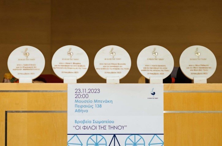 Την Πέμπτη 23 Νοεμβρίου 2023, το σωματείο ΟΙ ΦΙΛΟΙ ΤΗΣ ΤΗΝΟΥ διοργάνωσε εκδήλωση στο Μουσείο Μπενάκη της οδού Πειραιώς, για να βραβεύσει πέντε προσωπικότητες που με τη δουλειά τους, το μεράκι τους και την αγάπη τους για το νησί, ανέδειξαν την ΙΣΤΟΡΙΑ τον ΠΟΛΙΤΙΣΜΟ και τις ΠΑΡΑΔΟΣΕΙΣ της ΤΗΝΟΥ.