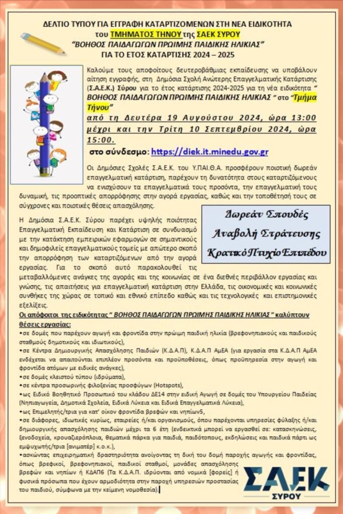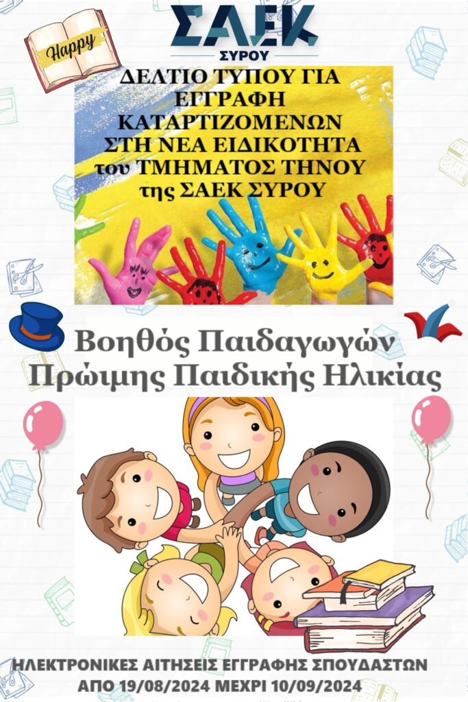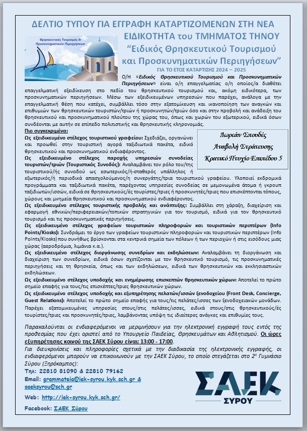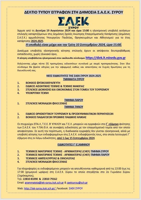 ΝΕΕΣ ΕΙΔΙΚΟΤΗΤΕΣ ΤΗΣ ΣΑΕΚ ΣΥΡΟΥ 2024-2025