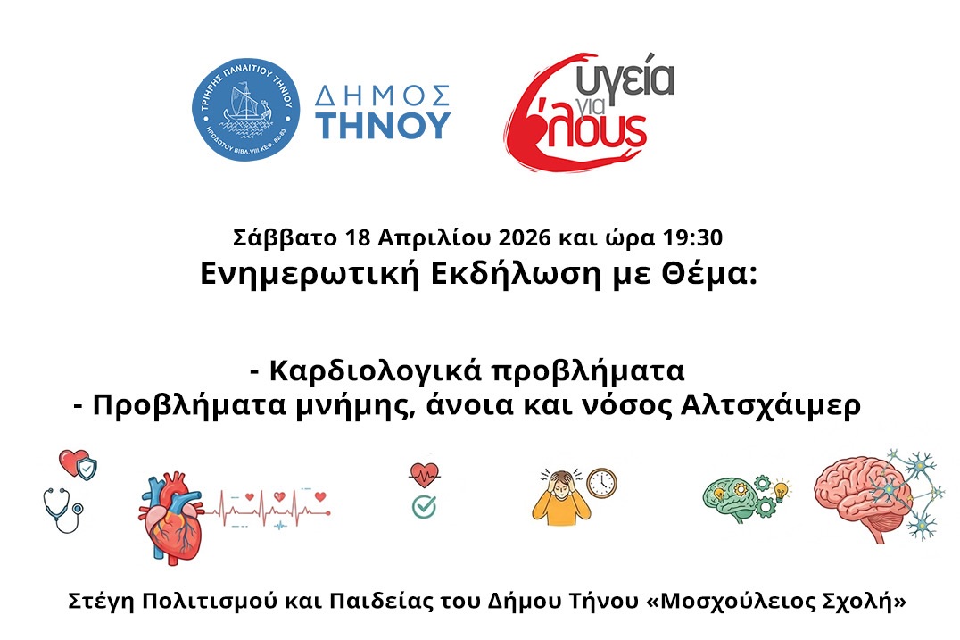 Το Σάββατο 18 Απριλίου 2026 και ώρα 19:30 θα πραγματοποιηθεί ενημερωτική εκδήλωση στη Στέγη Πολιτισμού και Παιδείας του Δήμου Τήνου «Μοσχούλειος Σχολή» με Θέματα & Ομιλητές:
