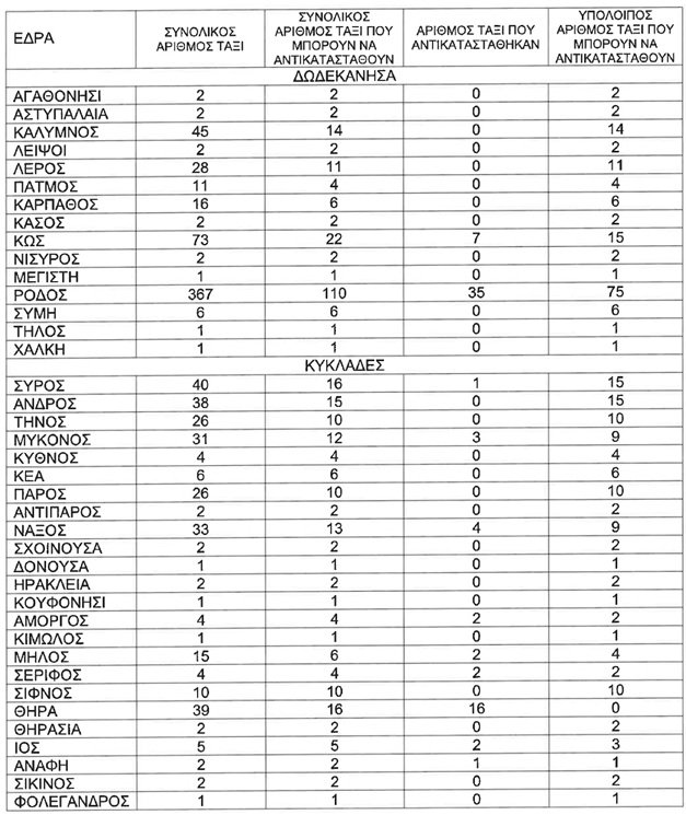 Ειδικότερα, ο αριθμός των Ε.Δ.Χ. ΤΑΞΙ αυτοκινήτων τα οποία μπορούν να αντικατασταθούν σε κάθε έδρα, αποτυπώνεται στον παρακάτω πίνακα: